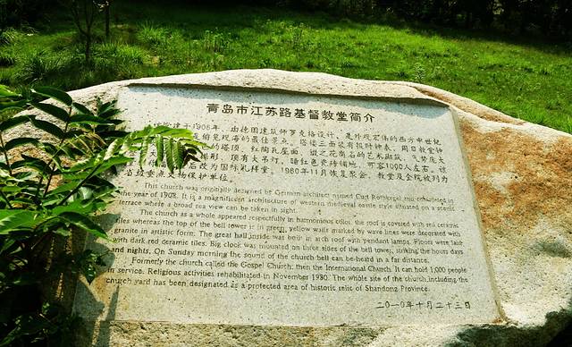 江苏路上还有一座基督教堂,位于青岛市市南区江苏路15号内小山丘上,东邻美丽的信号山公园。它是一座典型的德国古堡式建筑,由钟楼和礼堂两部分组成,在上面可以观看远处大海的景色。