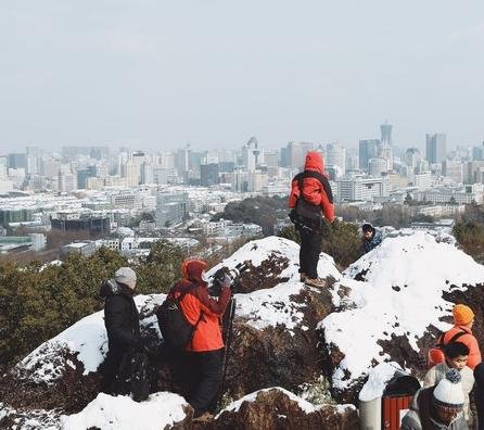 但在下雪天要爬上宝石山,还是需要一番功夫的。脚下湿滑异常,一不小心就容易摔倒。还好我穿了抓地力较为强劲的鞋子,手脚并用,才不至于跌倒。