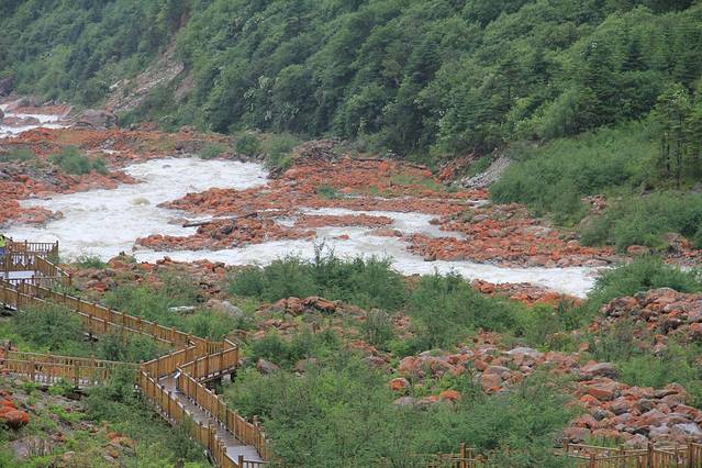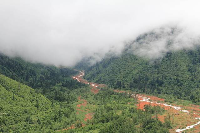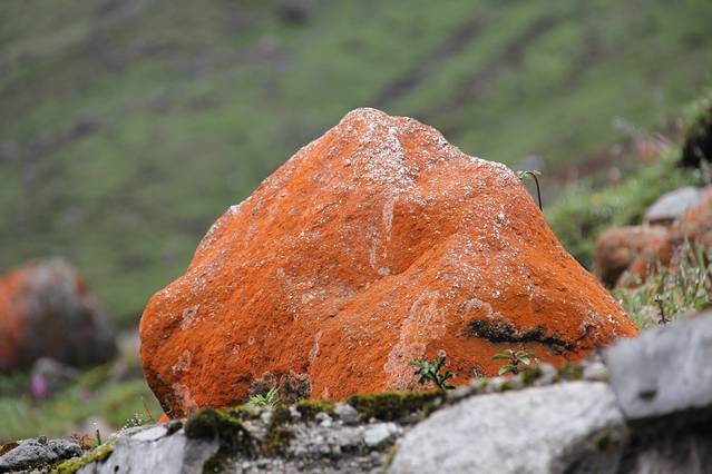 但抬眼望去,这条红色的浊流竟完全望不到尽头,在两边高山与无垠的绿色之间就这样赤条条的淌了出来,“这是大地在流血”身旁的诗人好友似感慨万千,另一位对石头颇有研究的好友则早已拿起一块仔细把玩着,“石头上的是些藻类”边说边放入旅行包。“你带得走石头,带不走蟒血的”王子在边上笑着说,“这里的红石,带走后就成了块普通的石头,再也没有红色了”石头迷听了也似很认同,“那我还是带回张照片吧”,他把红石放在高处,取相机给了张特写。