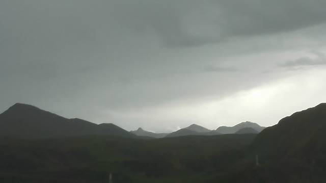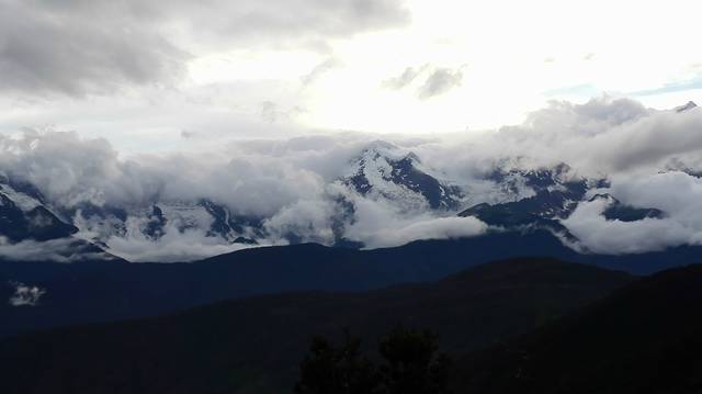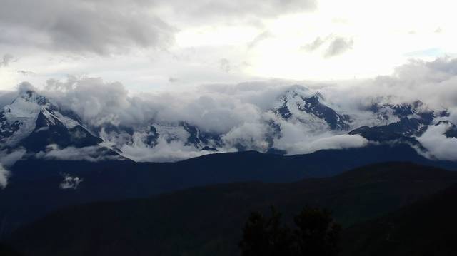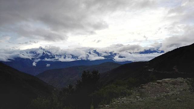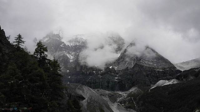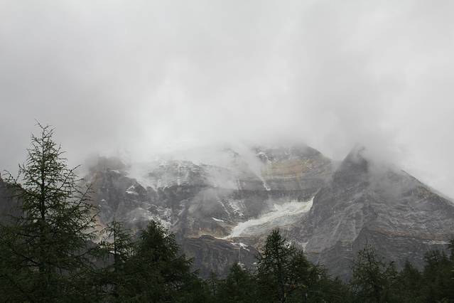 下车远眺时,雨已渐渐要停了,天边也露出一片阴冷的白色,在巨大山峰的的映衬下,让人凛然。