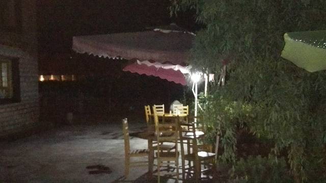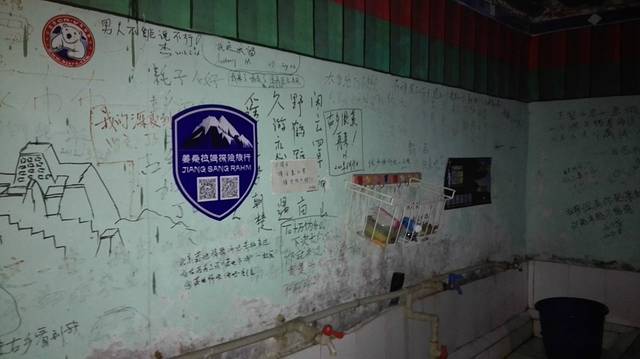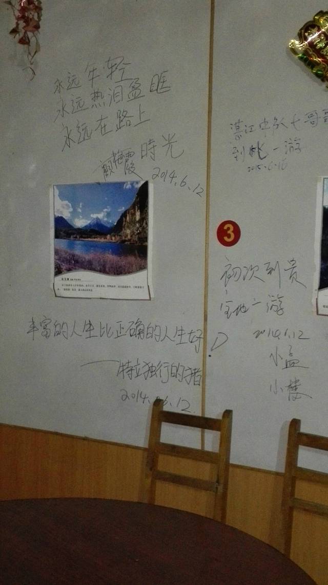 酒店干净且简单,在享受了老板的独门绝技古乡鱼后,我们游兴未散,就信步逛了逛。墙壁上有各种各样的旗帜和涂鸦,都是各地的旅行俱乐部经过此地留下的。
