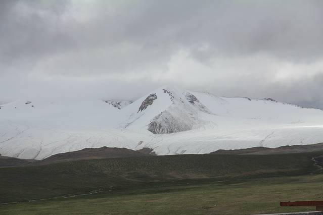 如此近的被雪山包围的确是第一次,目力所及的地方,全部被雪山阻隔,天色也变得阴沉起来。皑皑的白雪统治了这个世界,一点斑驳的绿色蜷缩在路基的周围,此外再看不到一点生机。这里是海拔最高的地方,很快就要到达唐古拉山口了。