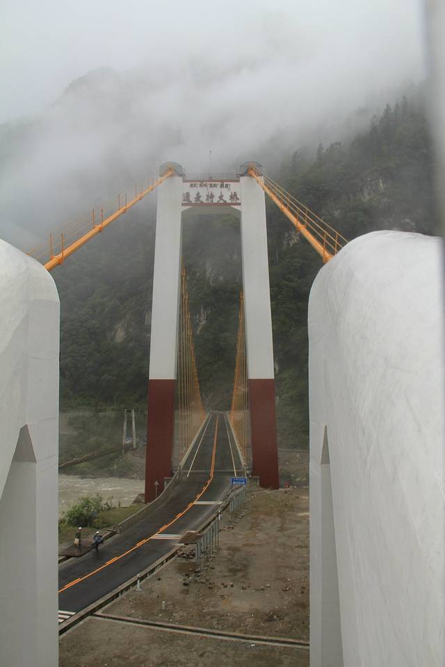 (通麦特大桥,川藏公路318国道的咽喉工程。大桥设计为双塔双跨悬索桥,跨越帕隆藏布的支流易贡藏布,全长258米,主跨为210米,高31.5米。)