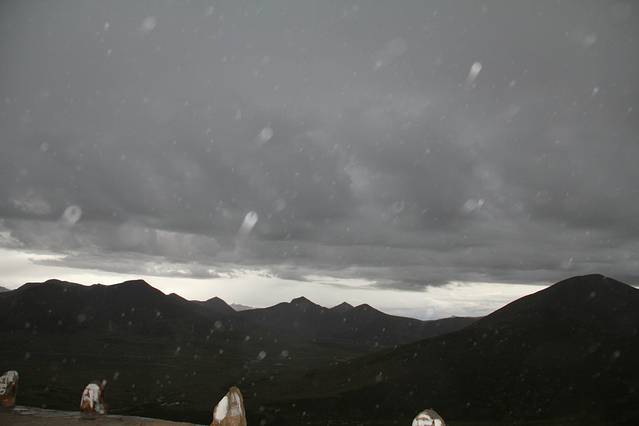 米拉山口,海拔5013米,是雅鲁藏布江谷地东西两侧地貌、植被和气候的重要界山,也是拉萨的门户,藏民心中的神山。刚到山下,乌云席卷天际,狂风暴雨骤至,雨刷几近疯狂的摇摆,雨点打击车身的声音也嗡嗡的响成一片。