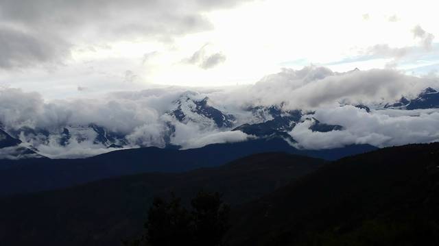 这条路也确实太烂了,满路的坑,我们在车上一个个欢快地上下起舞,诗人居然也不吐。王子倒似来了兴致,“这座山叫白马雪山,是三江汇合处,翻过就能看到梅里雪山了。你别看这路烂,再过几年路都修好,想走这烂路也没有了。不烂没味道嘛。”我看着越来越差的路况,从车窗又看到外面的深渊,太阳也被山遮住了,我真的后悔了,忽然想拿起手机给家人打个电话,“这哪有信号啊”我眼睛都瞪圆了,诗人和石头也紧张起来,赶忙掏出手机看,也都没有。“别担心,一会儿就有了”王子依然兴致昂然的说着,他的快乐是我们走下去的唯一依据。