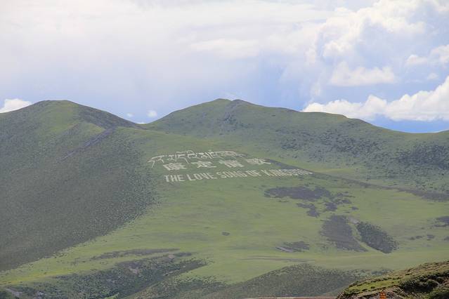 但随着海拔越来越高,高原反应也随之袭来,头晕脑涨加上浑身酸痛,到达山顶时,诗人已经下不了车了,这对于他注定是一个无法弥补的损失。当我们来到景点迎面扑入视野的是汉藏文刻画的四个大字“康定情歌”,这四个字不是刻在碑上,而是用巨石在对面的远山摆成的,青山白石,荡气回肠。