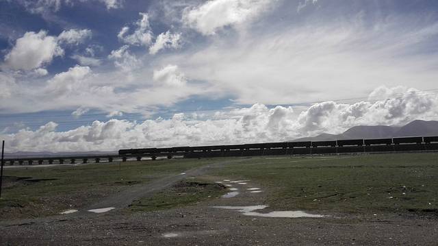 在辽阔的青藏线上只横亘着一条昆仑山脉,平坦的公路,辽阔的视野,甚至有时会看到远方的火车在天际间疾驰,一切和川藏线截然不同了。