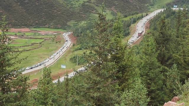 在微茫的天色中,我们看到了远方那些聚集在蜿蜒山路上的各色蚂蚁们,“318变成了停车场”诗人打趣道。“这也算是道奇景吧”我拿起单反当成了望远镜眺望着,“我见过的最长的车队”