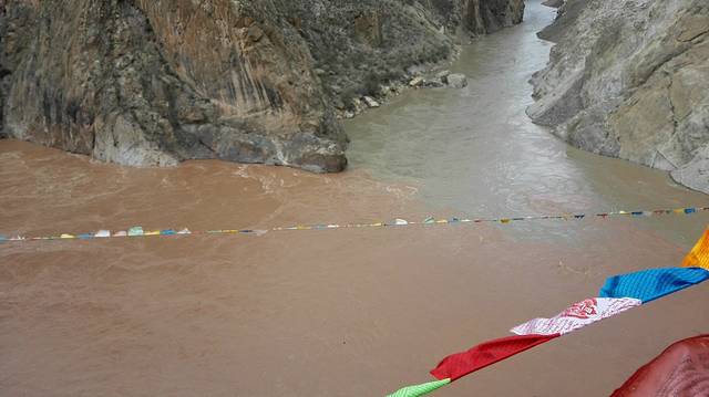 这里是金沙江与怒江的交汇处,暗红色的金沙江水裹胁着怒江滚滚向前,蜿蜒于山间。