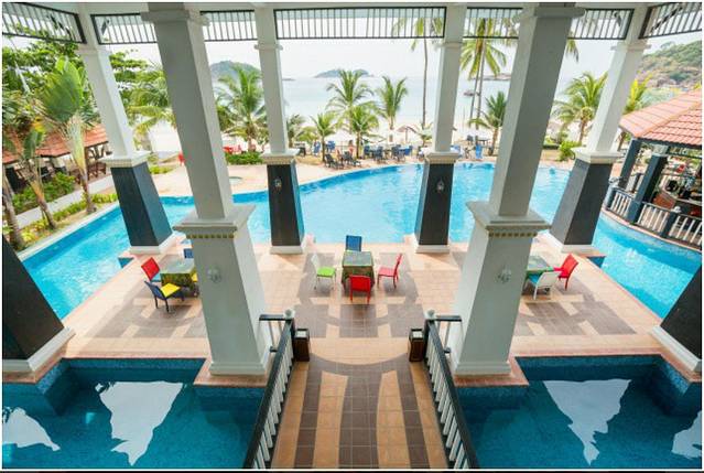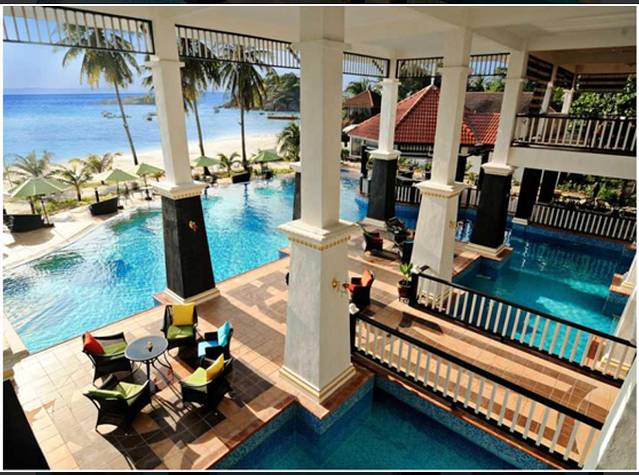 沿着沙滩往里走,就可以看到热浪岛的酒店,大大小小,大概十几家,而飞鱼给我定的这家诗巫岛莎莉太平洋温泉酒店(Sari Pacifica Beach Resort & Spa)。