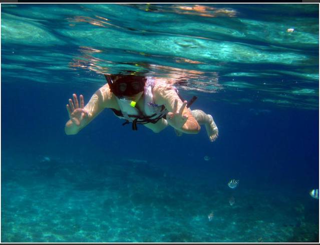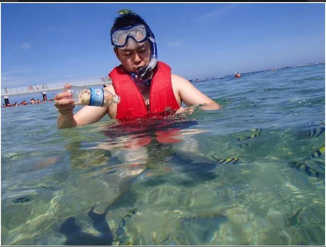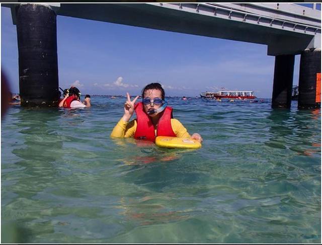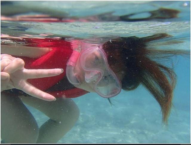 不一会我们就到海洋公园了,因为有第一次的经验,所以这次适应得很快。我早早就游到了深水区,在工作人员的陪伴下开始浮潜。