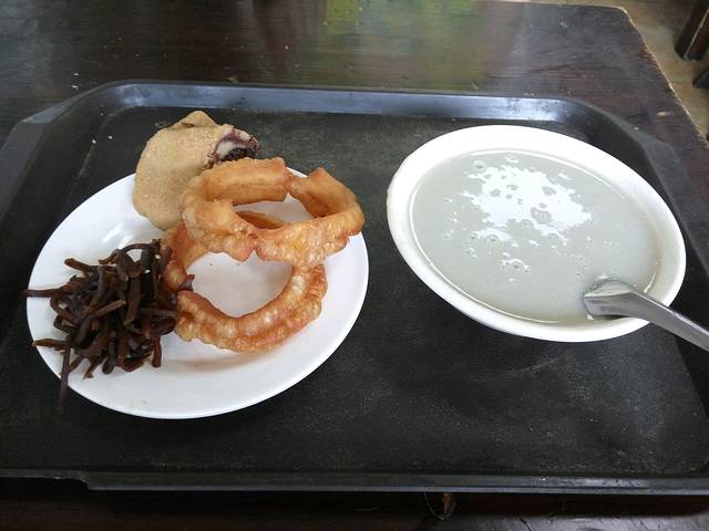 瓷器口豆汁,即使充分做好心理准备,豆汁还是很难喝,两个人只点了一碗还剩了大半碗,焦圈吃起来像干了的油条。