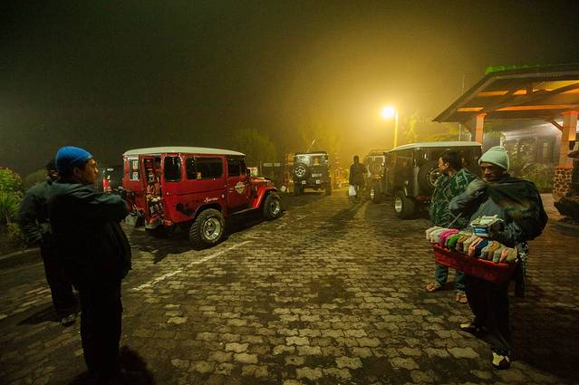 闹钟在凌晨4点准时响起。我们简单的收拾了一下便来到了酒店的院子里。很多车已经在这里等待了。旁边这辆红色的JEEP就是我们乘坐的汽车。很奇怪,他们喜欢在挡风玻璃上贴面各种图案,很影响司机的视野,似乎他们已经习惯了酱紫的感觉。因为早晨的雾很大,坐在副驾驶上的我目测能见度不足10米,加上挡风玻璃上的贴花,让我实在看不清前面的道路。我们一共4辆车,开的风生水起,不知道是雾大了,还是司机是新来的,他们居然开错了路…不管怎么样,我们还是顺利在半个小时后抵达了布罗莫的观景台。