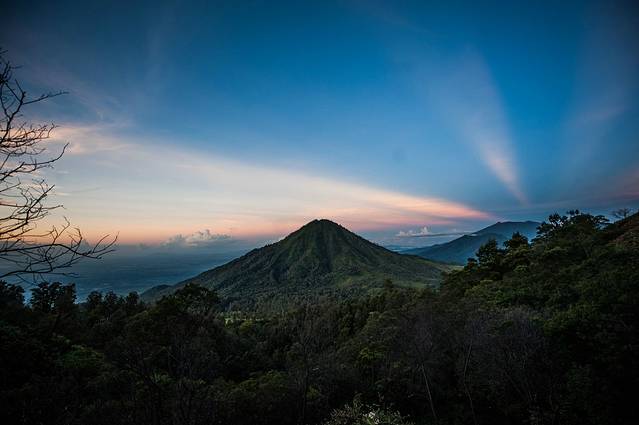 从大本营到IJEN大概有4公里,向导告诉我们可以把这4公里分为三段。第一段是相对平缓的上坡,行走很容易;第二段坡度比较大,行走变得比较困难;最后一段平坦,走起来比较轻松。刚走到第二段的时候,太阳渐渐出来了,看到佛光高照一样的景色,赶紧咔嚓了一张……