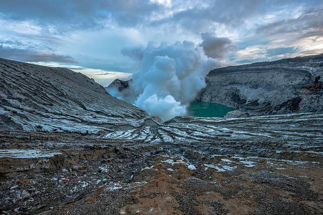 宜珍和布罗莫不一样,宜珍可以下到火山口里面去。因为宜珍盛产硫磺。仔细看的话,能发现冒烟的地方有很多工人在搬运硫磺。