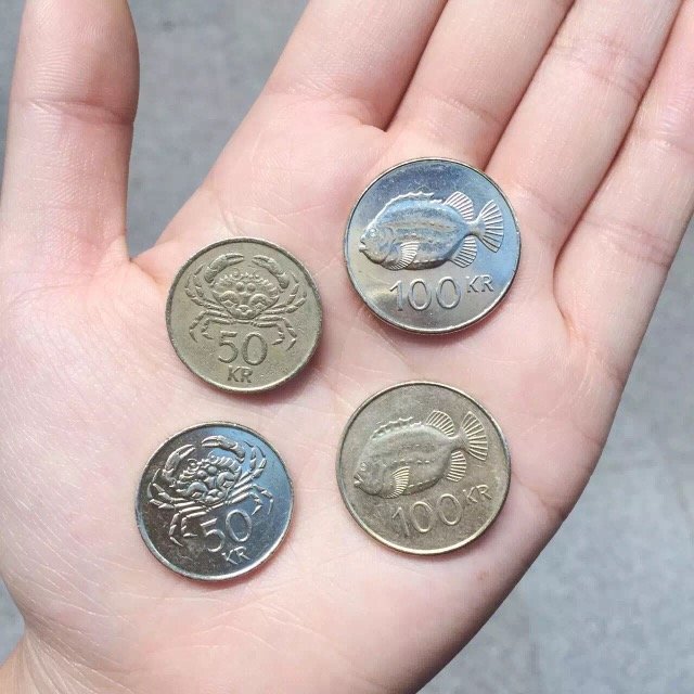 冰岛克朗与人民币20:1,瞬间我们就发了~~~硬币非常可爱,全是各种鱼虾蟹之类的。