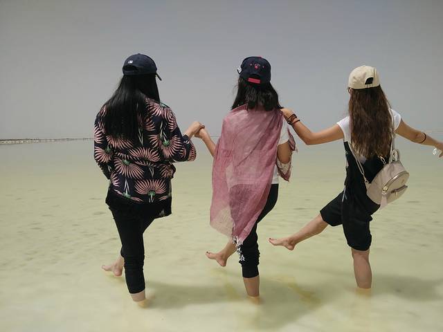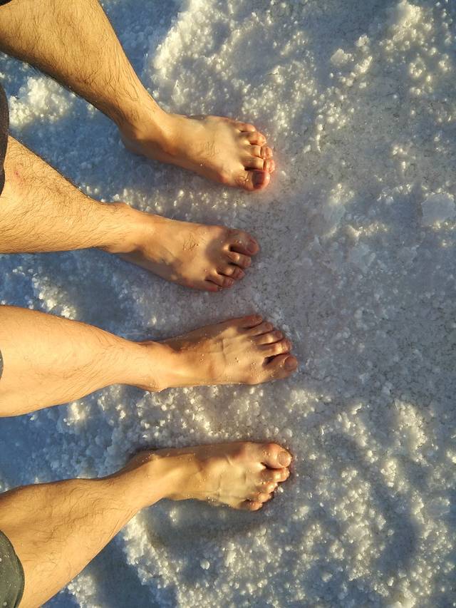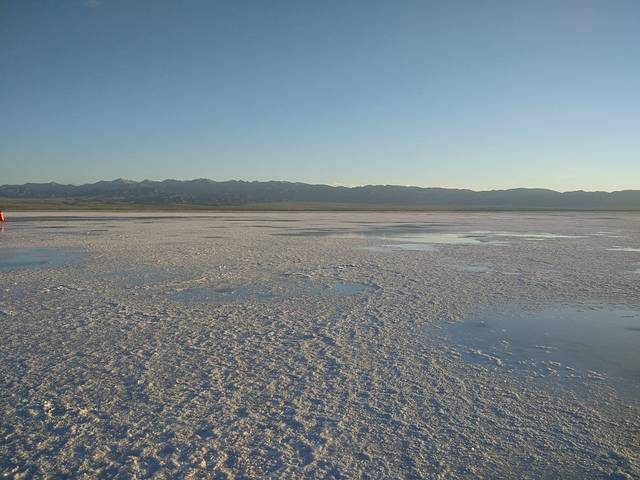 午饭过后回到民宿休息,楼上住女生楼下住司机,刚刚入睡不久被赵大脾气将自己反锁在卫生间的求救声唤醒,17点30分所有成员集合完毕前往“天空之境”(时间为老板建议)。第一次看到“白雪皑皑”的盐湖确实惊艳,可碍于当天的大风无法拍出度娘上天空之境的照片,可依旧不能停止我们在盐湖中畅快的消毒!湖水中优很多溶洞,一不小心就会掉下去的感觉。盐的颗粒很大,踩上去非常卡脚,赵大脾气高风亮节不下水主动担当起了看护物品的职责。都说茶卡的日落很美,张晓横、云大条在寻找各处拍照的绝佳场景。不知不觉中,已至日落,从工作人员口中才得知想拍出镜面的照片需要太阳当午的时候,又遇当日风大,计划偏离!但是在唯美的日落夕阳下,相机、手机记录了许多难忘的瞬间。在“兰州料理”简单解决了晚餐后,我们又回到了盐湖景区外观看星河,仰着脖子细数夜空中最亮的星,由于设备不专业未能记录下茶卡美丽的星空。夜间张晓横接过了赵大脾气的接力棒将自己反锁在卫生间而不得不求救。司机拖着疲惫的身子等候洗掉身上的盐渍,一夜无话,晚安,茶卡!