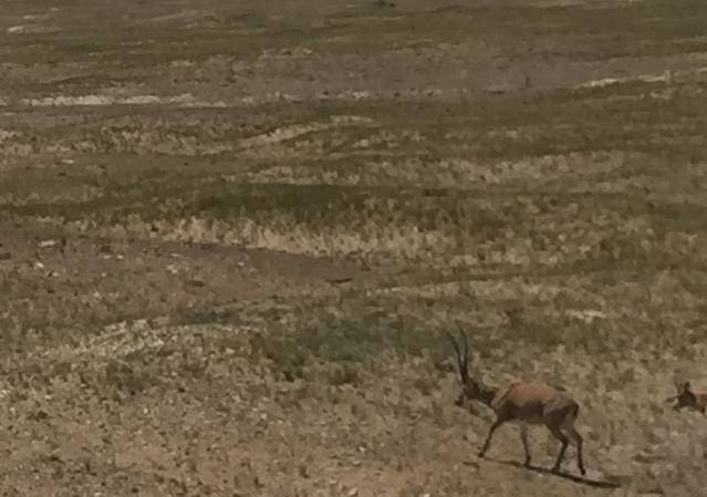 “万山之巅觅灵根,千江源头远俗尘。雪域净心息浊欲,常有梵歌伴白云。”画家王心鉴过此题诗道。旅程继续向前,我们继续深入可可西里腹地,一头藏野驴闯进了视线在我们车前穿过马路,这是在保护区内见到的第一只保护动物,与我们尽赏路旁天高云低、地势高亢,天地相接,远处冰山、湖泊、河流,在这里除了震撼还是震撼!到达索南达杰保护站也是到达了我们这次行程的最终点,短暂的休憩后开始了返程,来时未能看到藏羚羊的遗憾在返程途中得以弥补,虽然lucky boy说是他带来的好运,可我还是坚信是由于更换了司机所得的幸运!看着藏羚羊(大家都这么认为)在路旁或休憩或饮水或奔跑,每个人心中更多的是欣喜和雀跃,其实在所看到的那些藏羚类动物中有藏羚羊也有藏原羚,只是我们分不清楚,不过能够看到就是幸运,看到那么多说明我们足够幸运!返程中再次遇到之前的朝圣者,我们用一天的时间在可可西里中到达索南达杰保护站一个来回,他们也许一天的时间仅行几十公里,凭借的还是心中执着的信念!再见,可可西里!在可可西里没有看到海!