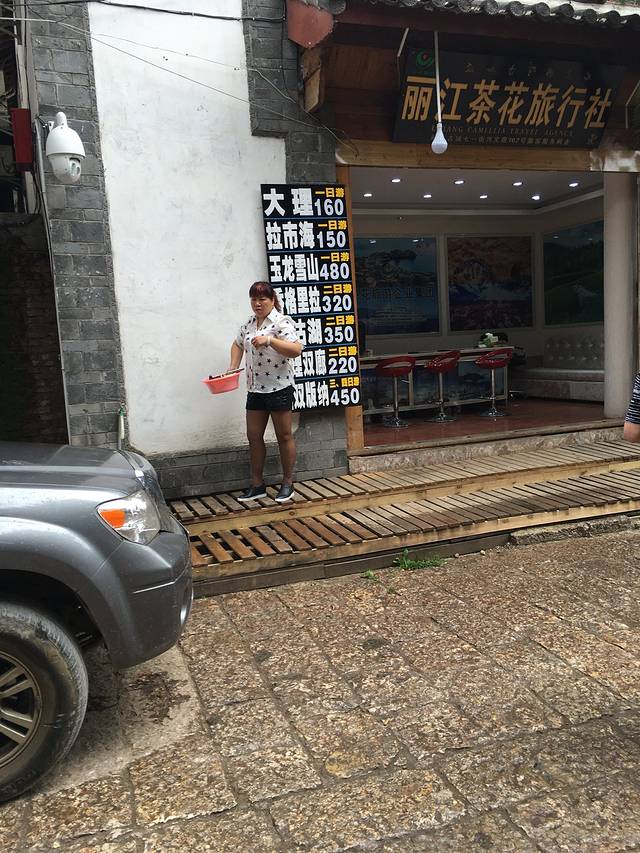 天气明显比前一天好多了,天空出现了点点蓝。相比夜晚的古城,白天的古城要寂静得多。到处可见推销旅游产品的旅行社,香格里拉两日游,拉市海一日游,玉龙雪山两日游,大理三日游……200块的,450块的,890块的……可谓琳琅满目,价格多变,令人眼花缭乱……