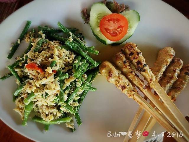 脏鸭餐这个名字的由来原因有二,一是鸭子散养在巴厘岛有名的水稻田里,吃野外小虫小鱼,常常搞得浑身泥巴;二是鸭子在烹制过程中,经过油炸、烧烤,表皮看起来颜色重重的,因此被称为“脏鸭”。全巴厘岛以乌布的脏鸭餐最出名,因为这里被大片大片的稻田环绕,水质好,鱼虫多,鸭子长得肥美。脏鸭餐是好几种小菜搭配的套餐,放在翠绿的芭蕉叶上,颜色就让人食欲大增。