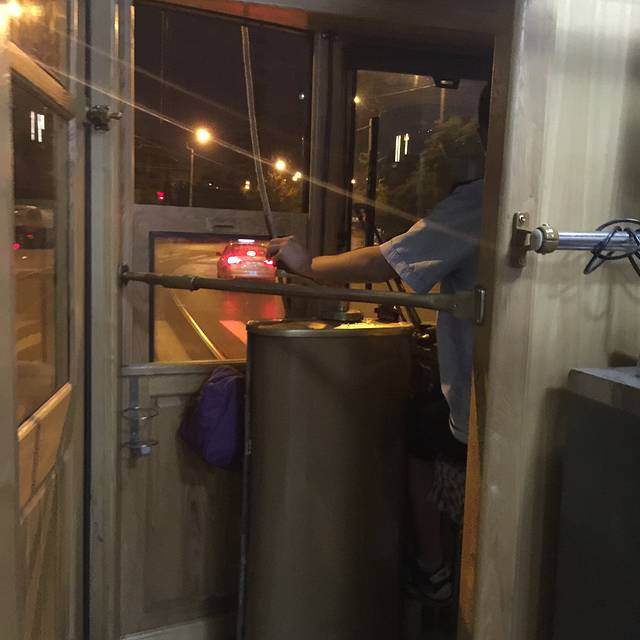 司机是个年轻小伙子,熟练的驾驶着有轨电车,方向盘是个能转的把手