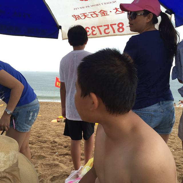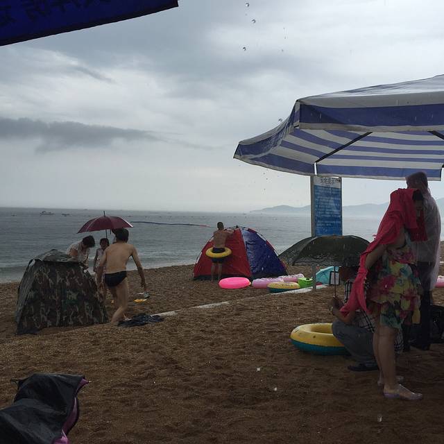 游着游着下起了雷阵雨,很多人跑到我们租的遮阳伞下面躲雨