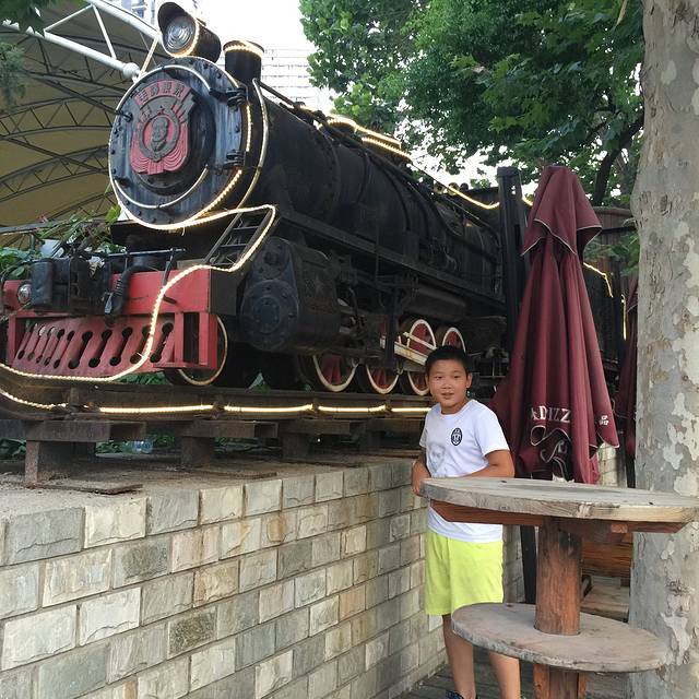 第一天坐火车到大连,找地方吃饭,路上看到火车站遗址,儿子可是火车迷啊