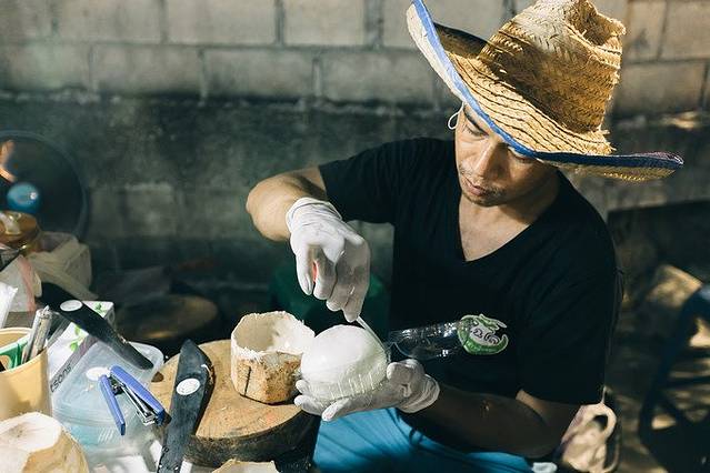 师傅用小刀一点一点把椰子的外壳去掉,出来的椰肉包住椰汁可以保持不破,就像一个灌了水的皮球。