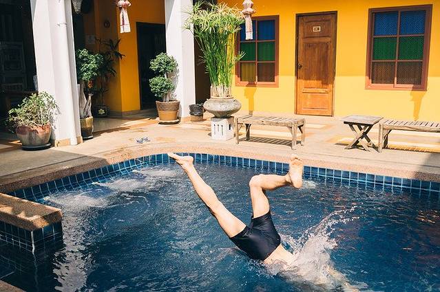 清迈精品屋酒店外有个不大不小的游泳池,太合适这个高温的城市了。