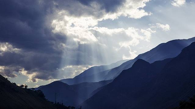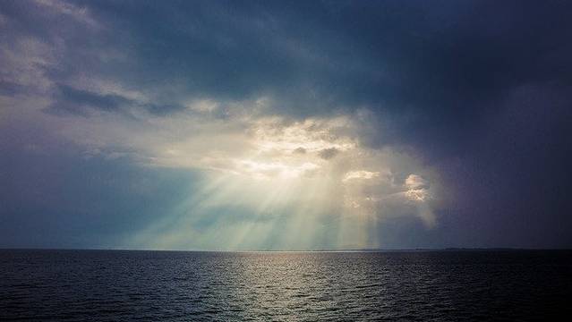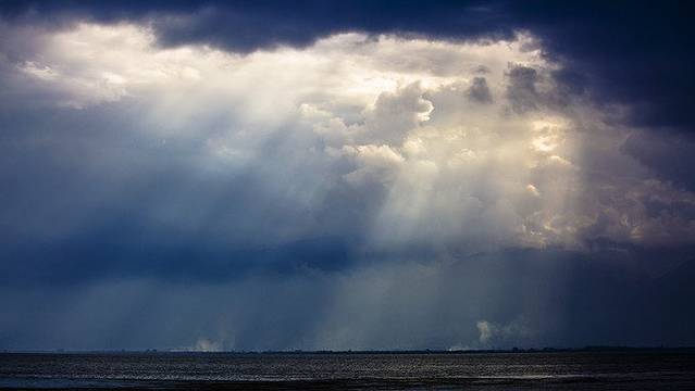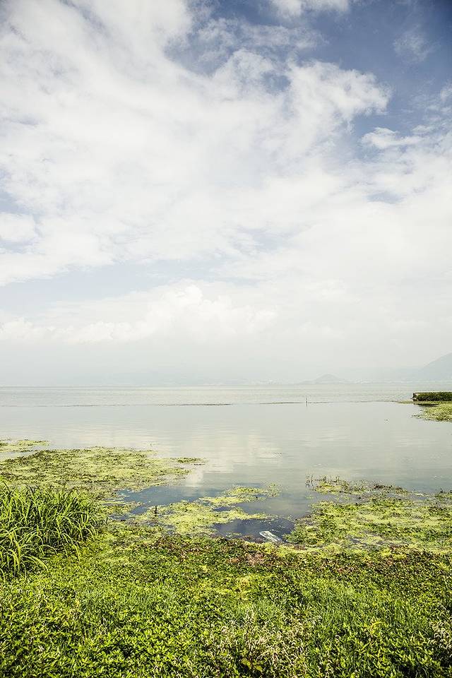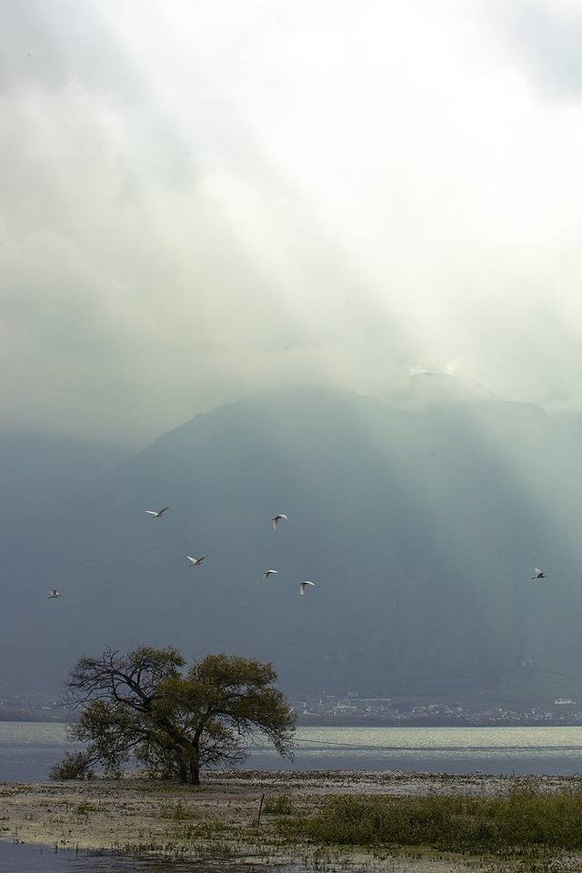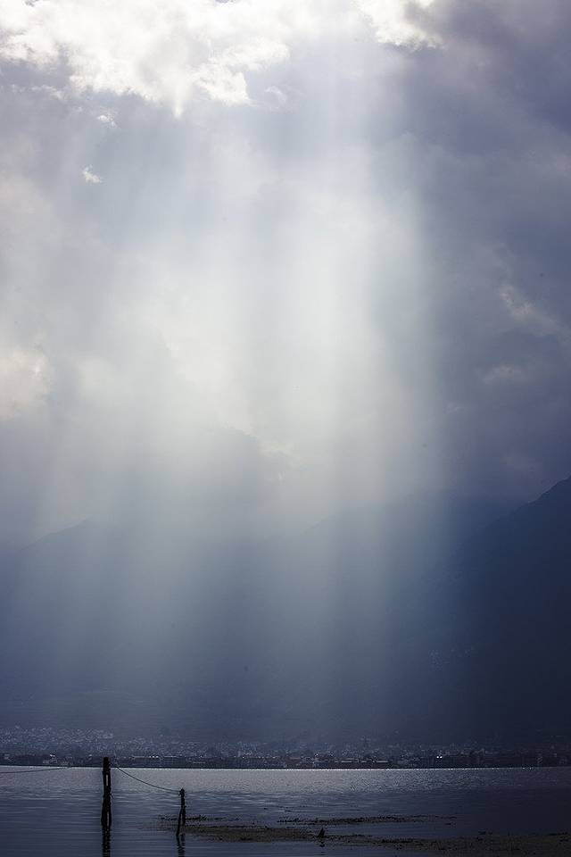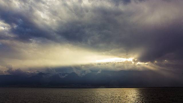 午后时分,天空中云层厚了起来。一道道光束从云层中川流而行,倾泻在洱海当中