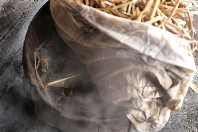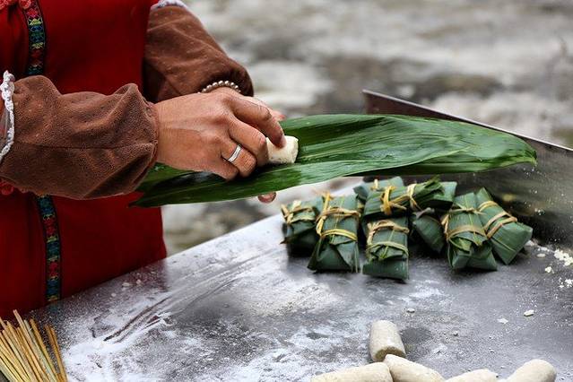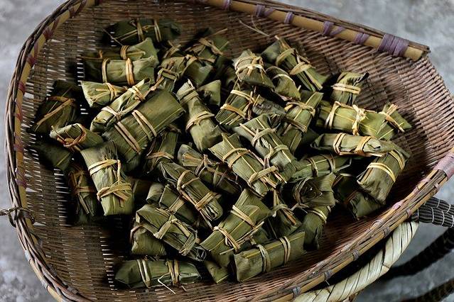 用竹叶和稻草绳将其包好。