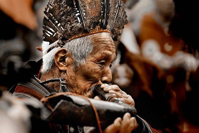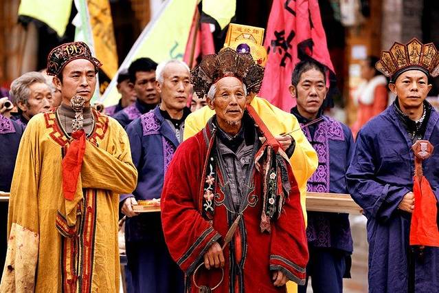 前排的老者是“仡佬敬雀”的“大祭司”,穿着典型的 “傩文化”服饰。而“大祭司”身后的三位“法师”,既有佛教的也有道教的。