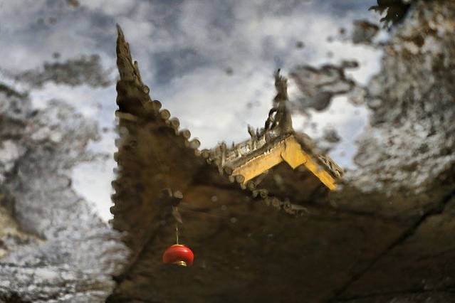 倒影的戏台飞檐。