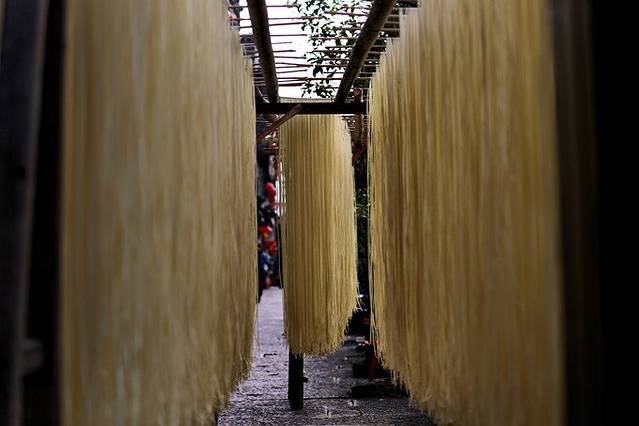 走到河边,便是夜郎风情街了。这里的店铺前,晾着自制的挂面。