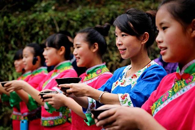 拦路酒歌,进村前姑娘唱着山歌敬一杯米酒,表示对客人的欢迎。