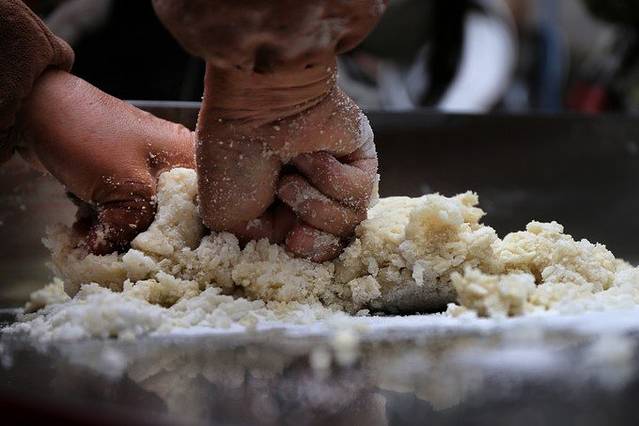 下面通过图片,来了解一下黄水粑这种美食不复杂的制作过程。首先,将糯米饭加糯米粉在加入黄豆打好的浆,反复揉搓和成米团。