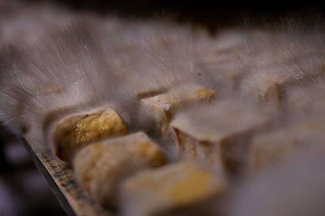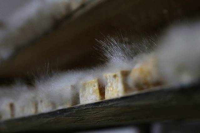 酱豆腐制作,需要一个菌丝发酵的过程,上图中菌丝上可见孢子。我们平时吃的酱豆腐,外面的那层“皮”其实就是菌丝。