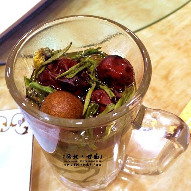 三泡台是兰州特色的一种茶饮,源自于回族,通常一大袋茶包里除了绿茶,还配有枸杞、桂圆、红枣、菊花、冰糖等等,用料很丰富,甜甜的蛮好喝,用来配开锅羊肉那是绝配!