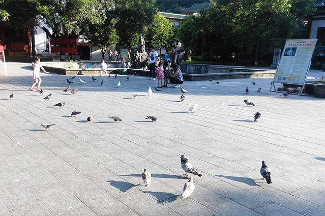过桥之后是一块挺宽阔的空地,多鸽子。有两个小池塘,有鲤鱼、鸭子、龟,假山石上也歇着不少鸽子。