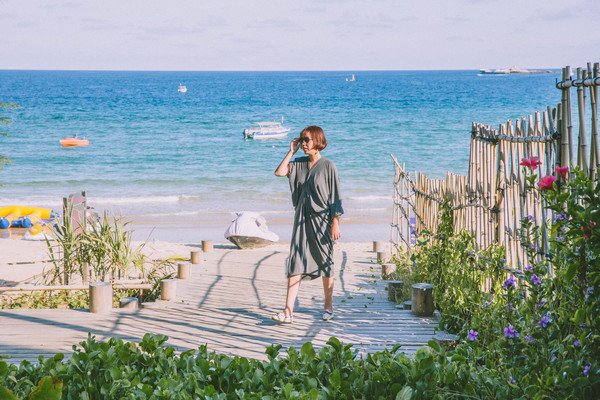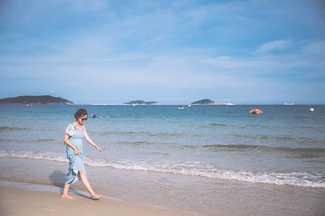 海水清澈,透明、浅蓝、深蓝三色分明,沙滩的入口处立了块牌子:海域情况复杂,禁止游泳。沙滩上人不多,我真是很诧异,因为青岛这时的海边,一眼望去绝逼是下饺子锅还不够大的场景,而这里,拍照都不用担心有路人入镜,美翻了,让我一度出现幻觉以为我又到了长滩岛了。