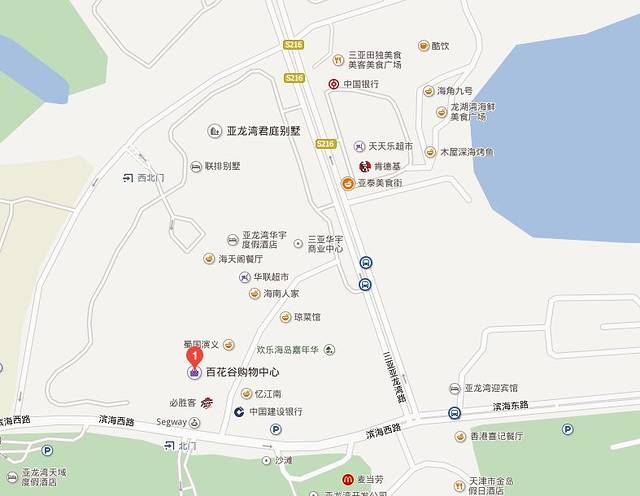 由于天色已晚,酒店也还没定,所以没下去玩耍。搜了搜导航,附近有个百花谷购物中心,在亚龙湾路和滨海西路的交汇处,集美食、购物、休闲娱乐为一体。里面有星巴克,我们先去降降温订个酒店,正事办完再出来耍。