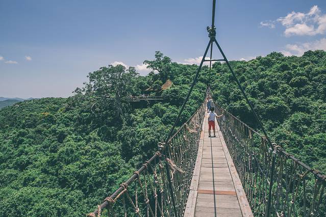 据说走在索桥上,近看山峦起伏,远眺辽阔海洋,听鸟语争鸣,闻花香四溢,仿佛置身于海天仙境,可惜这些我都没看到。桥又长又高又晃还有小孩在蹦,我站在刚走出1%的地方就停住了不敢走,沙沙在前面没法返回就走过去了,然后我让他绕一大圈返回入口接我,我很生气他不等我所以不想理他,他也很生气怪我说好要去又不敢走,他说两岁的小孩都敢你不敢,你过山车都坐了不敢走这个,然后也不理我,不跟我说话,然后臭着脸把仅剩的半瓶水递给了我(此处虐狗)。