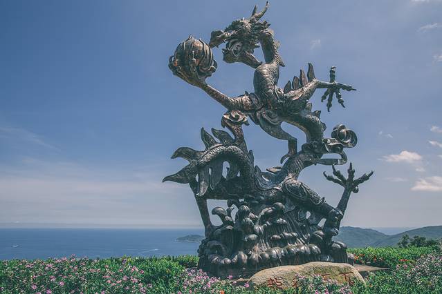 我们又绕着小路,走到索桥的出口,乘坐游览车继续向前,下车后本想蹭个导游听听,没想到全是套路,想把我们带进茶楼,我这么机智当然是逃脱啦,于是来到一个揽景圣地---龙行天下铜雕。