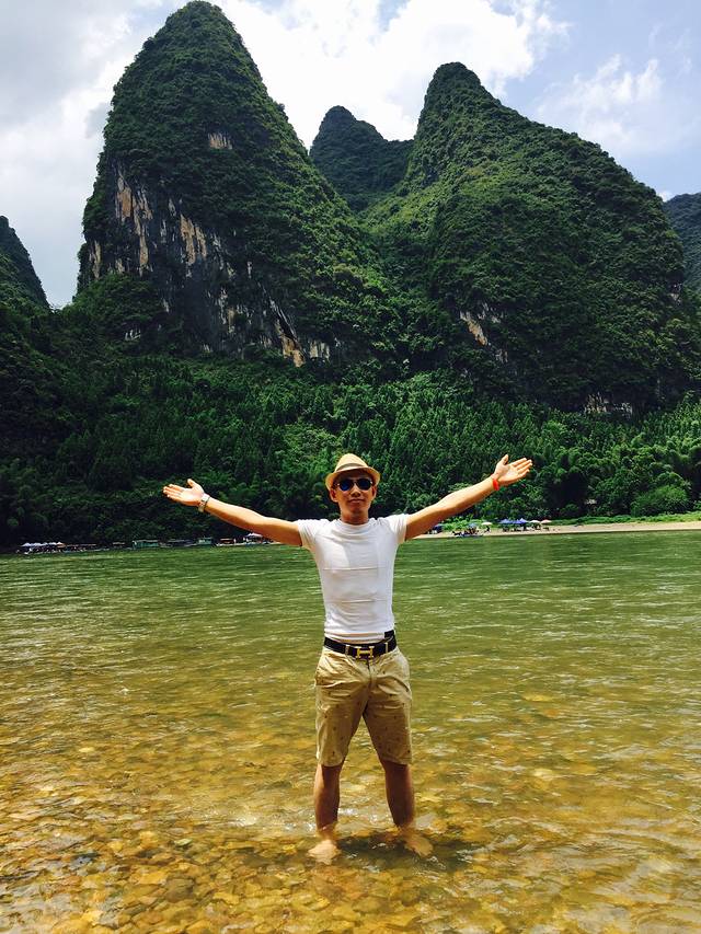 一早起来租个电动车和两个客栈的美女驴友去兴坪古镇,一路的风景。在路上的感觉真好。看了20元人民币观景台,九马画山,对于北方的孩子来说,山水真的远大一切的景点的美。新鲜的空气让你就觉得舒服,山清水秀,正如胡志明即兴赋诗“桂林风景甲天下,如诗中画画中诗”。骑小电驴往回走。回到凤尾竹,和小伙伴商量好拼饭。洗个澡等着大厨给咱们做饭吃。店长厨艺还是很厉害的,几乎可以超越我,一大桌子菜,有竹笋鸡,啤酒鱼。不过大家饭量都没有那么好。义工哭着说,剩下的菜他明天要吃一天才能吃完。吃完饭,我专门买条大短裤去泡泥浴,我骑电动就去了,到了之后,没开门不说,电动车还没电了。我把车又连骑带推弄回来,算做了一把汗浴,全身都湿透了。为了抚平我的创伤,晚上继续西街小马的天走起。