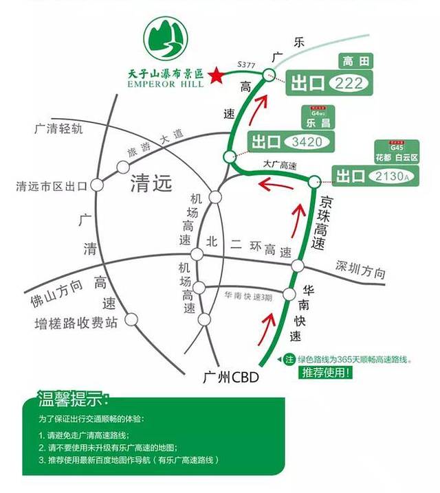 *佛山、南海、顺德出发:广佛高速—环城高速—机场高速-大广高速(乐昌出口)-广乐高速(高田出口)--过高田镇后看路牌行驶