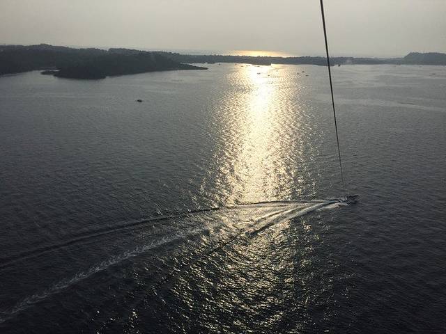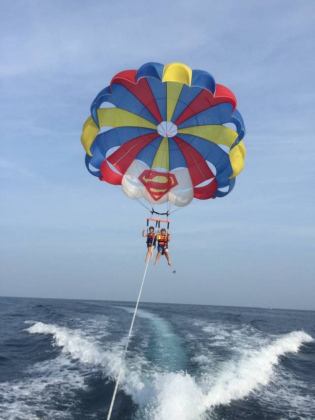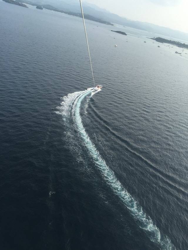 苦苦等了1个多小时(前几天一直雨天,加上国庆,堆积了一堆客人,导游说他这么久来第一次见到要排队等那么久),终于到我们了:6个人上快艇,3个小黑开快艇把你拉到海中央,两两上天,可以在天上呆15min,加上在快艇上等另外2pair的半小时,其实玩一次也需要1个小时左右了。除了很好玩的降落伞,其实在快艇上的半个小时也是很享受,看着落日感受海风,感觉这1300P真的超值。