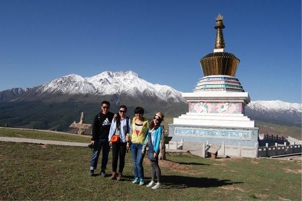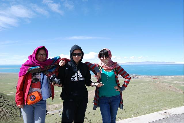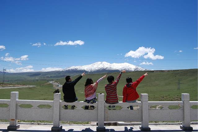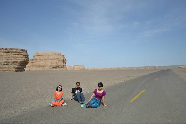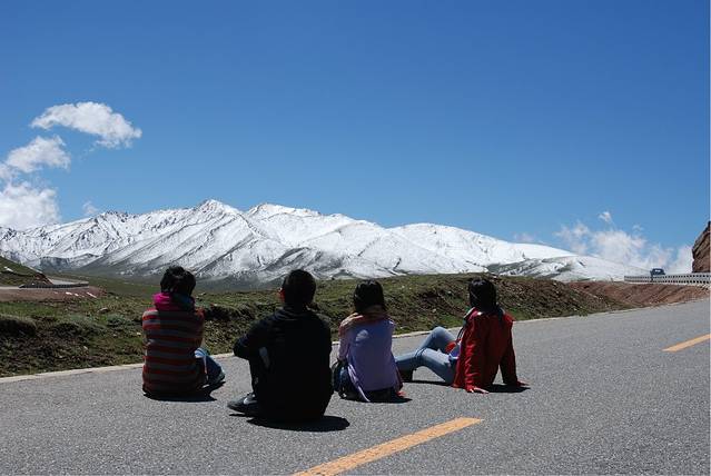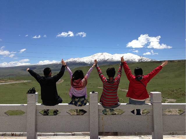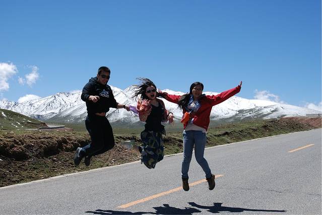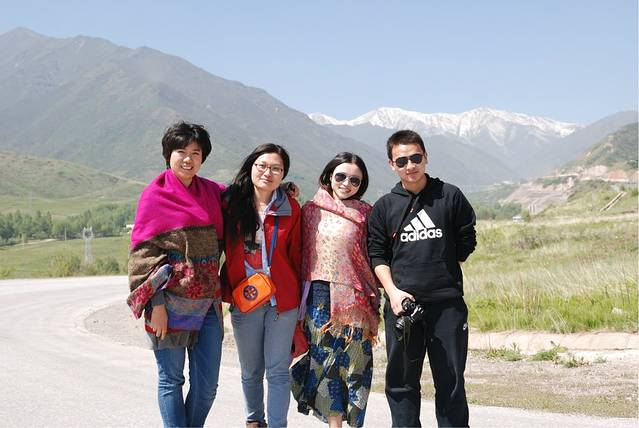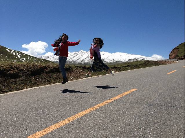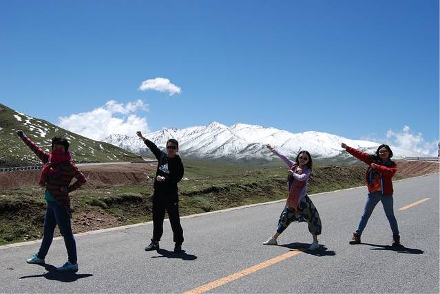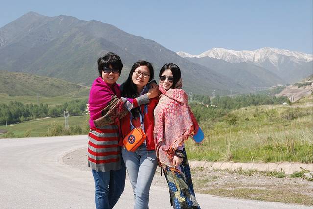 离开塔尔寺后师傅开车到一段风景很美的公路上,专门停车让我们拍照(从左到有:珺珺、媛媛、我、tomato)