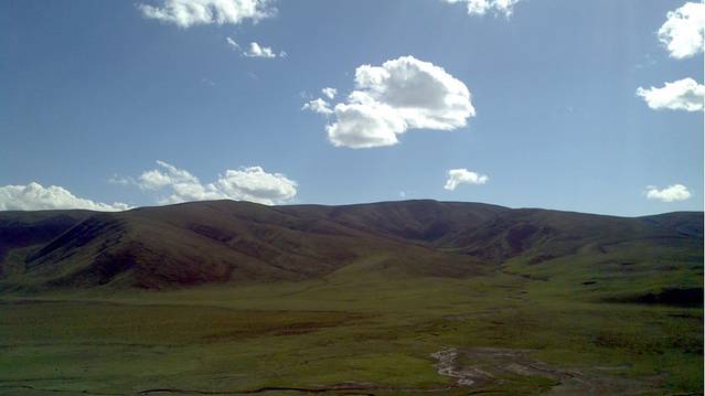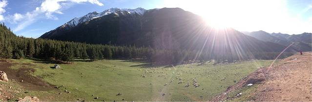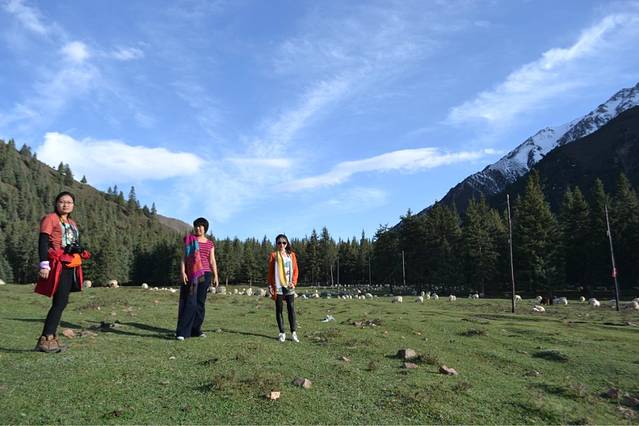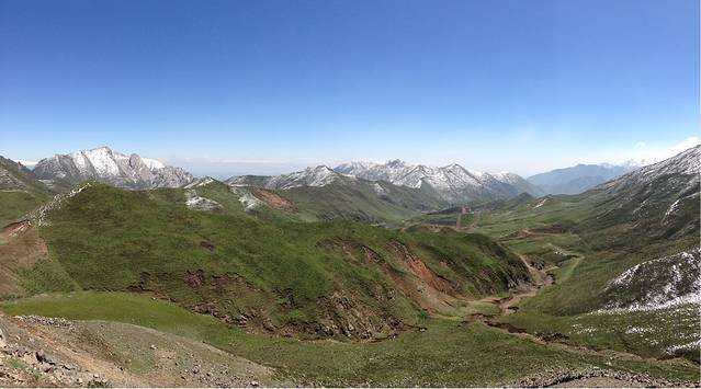 从大冬树山一过,又是一路的群山、冰沟,途径一个牧场,虽然一路上见过太多的牛羊了,但这个非常美丽画面感超强的牧场还是吸引我们下车,并且为了下到牧场,我们是从一面特别陡峭的山坡爬下去的。