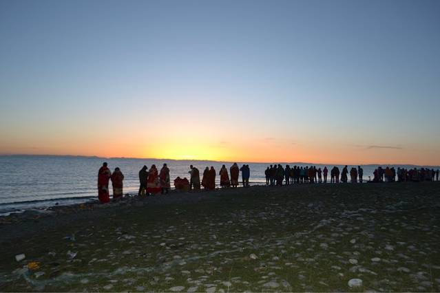 他们一群在青海湖边等着日出的人都是把酒店的毛毯穿出去的,强悍!