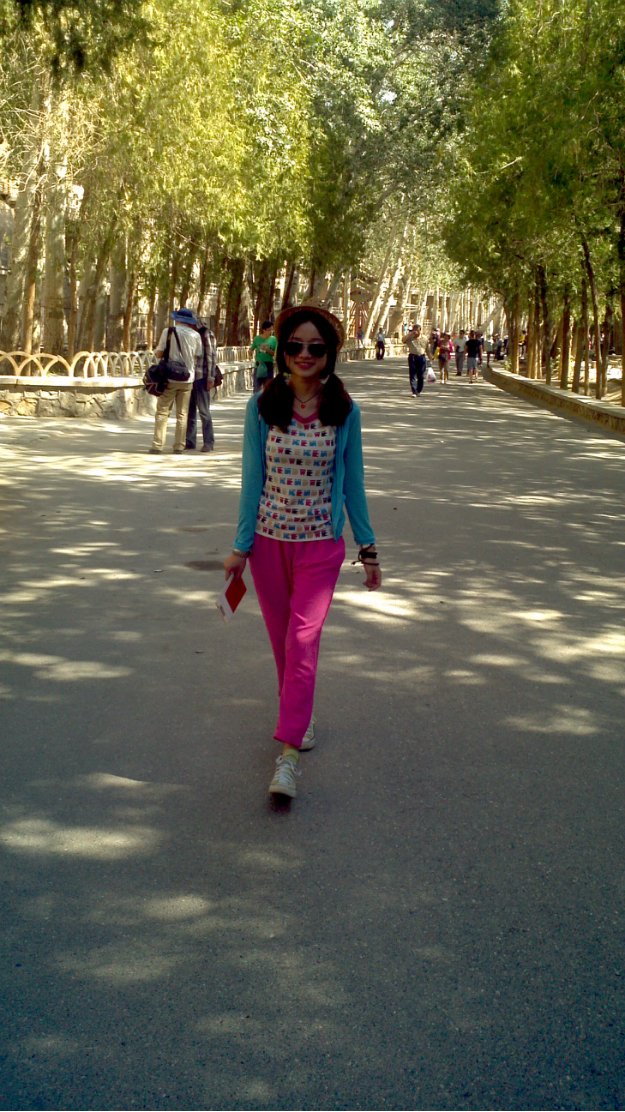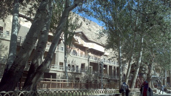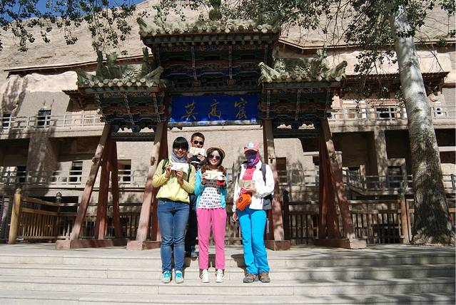 莫高窟里面是不能拍照的,我们很自觉的上缴了照相机和包,在门口留影一张而已。